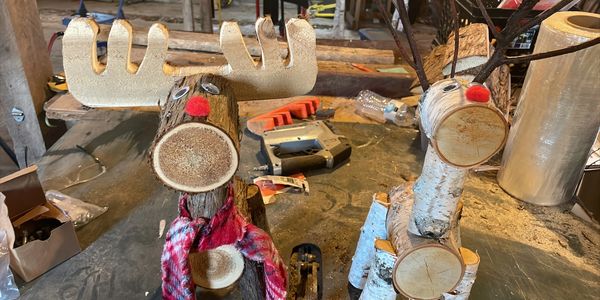 HANDMADE CEDAR MOOSE AND BIRCH REINDEER.